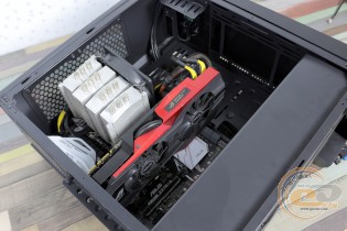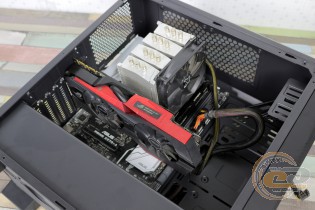 The ASUS ROG Matrix Platinum GTX 980 graphics card with a length of 309 mm looks very compact inside, as the case can accommodate 395-mm solutions. When installing a front fan, this figure will decrease to 368 mm, and when mounting a radiator in front, the length of the graphics card should not exceed 335 mm. As we can see, in any case, even a triple-fan GTX 1080 Ti will easily fit inside the novelty.