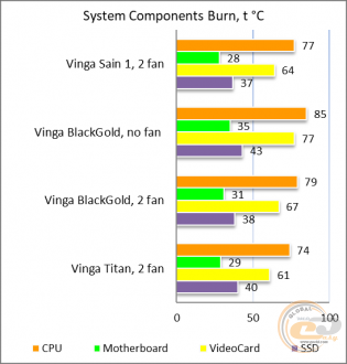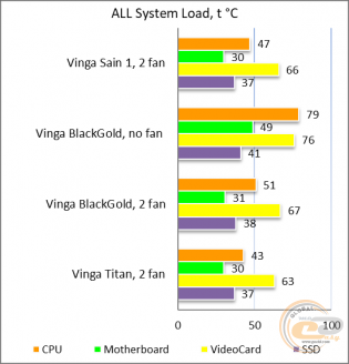 The "All System Load" chart shows the heating of components after 30 minutes of 3DMark Fire Strike in Ultra mode (4K resolution). The "System Component Burn" mode demonstrates temperatures under load with AIDA64 (Stress CPU and FPU) and MSI Kombustor for 15 minutes.