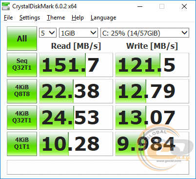 The average read speed of the built-in drive in CristalDiskMark tends to 152 MB/s, and the write speed reaches 122 MB/s. These are typical indicators for eMMC memory. If higher performance is required, a solid-state drive should be installed.