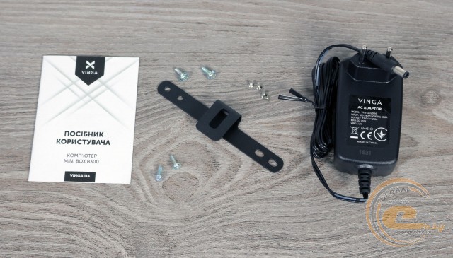 Inside the box with the Vinga Mini BOX B300, we found a power supply, user manual, and a bracket for mounting the device behind a monitor or TV.