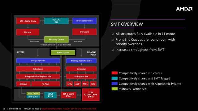 Для її реалізації Джим Келлер зі своєю командою вирішив відійти від застосованого в AMD Bulldozer підходу CMT (Clustered MultiThreading) і повернутися до популярнішого та ефективнішого SMT (Simultaneous Multithreading). До речі, саме SMT активно використовується компанією Intel. По-друге, розробники вирішили не допускати помилок попередньої структури та наділили кожне ядро всіма необхідними обчислювальними блоками, щоб мати конкурентну продуктивність як в однопотоковому, так і в багатопотоковому режимі.
