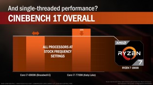 Що ж стосується продуктивності в однопотоковому режимі, при однаковій тактовій частоті (3,5 ГГц) обидва конкурента від Intel вириваються вперед: на 2,7% і 6,5% відповідно. Якщо порівнювати їх показники при стокових частотах, Intel Core i7-6900K знаходиться на рівні AMD Ryzen 7 1800X, а Intel Core i7-7700K виривається вперед на 15%. Цікаво, що компанія AMD не стала ховати такі результати, а зіграла на випередження незалежних оглядів і чесно вказала сильні та слабкі сторони AMD Ryzen.