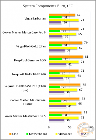 Навіть незважаючи на те, що трьом переднім вентиляторам практично ніде брати прохолодне повітря, корпус Vinga Barbarian демонструє дуже належні результати. Чи не рекордні, але у «бруд обличчям» він не падає навіть на тлі куди більш дорогих і іменитих суперників. Правда, в останні ще можна встановити додаткові пропелери і поліпшити ситуацію, тут же це практично максимум. Що стосується акустичного комфорту, то у нас не виникло жодних нарікань.
