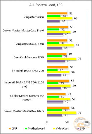Діаграма «All System Load» відображає нагрів компонентів після 30 хвилин 3DMark Fire Strike в режимі Ultra (роздільна здатність 4K). А режим «System Component Burn» демонструє температури при навантаженні додатками AIDA64 (Stress CPU і FPU) і MSI Kombustor протягом 15 хвилин.
