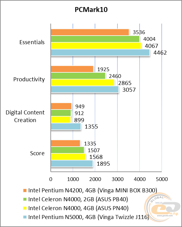 Практично у всіх тестах цілком очікувано лідирує ноутбук, а три міні-ПК борються в своїй пісочниці між собою. У цілому рівень продуктивності новинки невисокий, але цього достатньо для запуску базових повсякденних додатків, роботи з офісними документами, пошуку інформації в мережі і запуску мультимедіа.