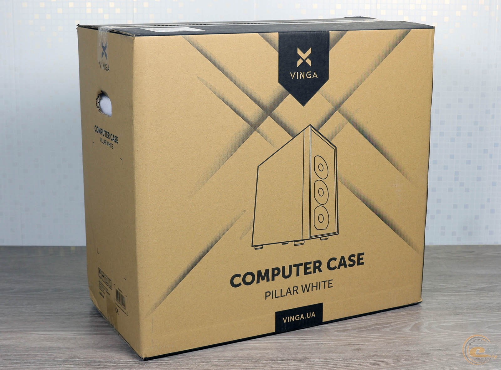 Vinga Pillar White запечатаний у звичну картонну коробку з простим оформленням. На її гранях можна знайти кілька неточне схематичне зображення корпуса (із трьома вентиляторами, хоч вони не входять до комплекту) назва виробу і специфікацію англійською та українською мовами. З боків є ручки для зручного транспортування.