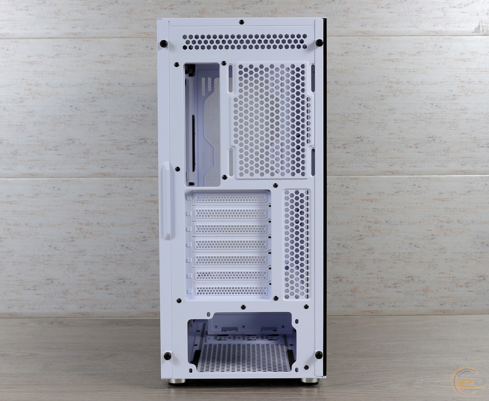 Тильна частина корпуса отримала сім горизонтальних слотів розширення, які прикриті багаторазовими заглушками. Поруч притулився виріз під інтерфейсну панель материнської плати і посадкове місце під 120-мм вентилятор із можливістю регулювання по висоті.