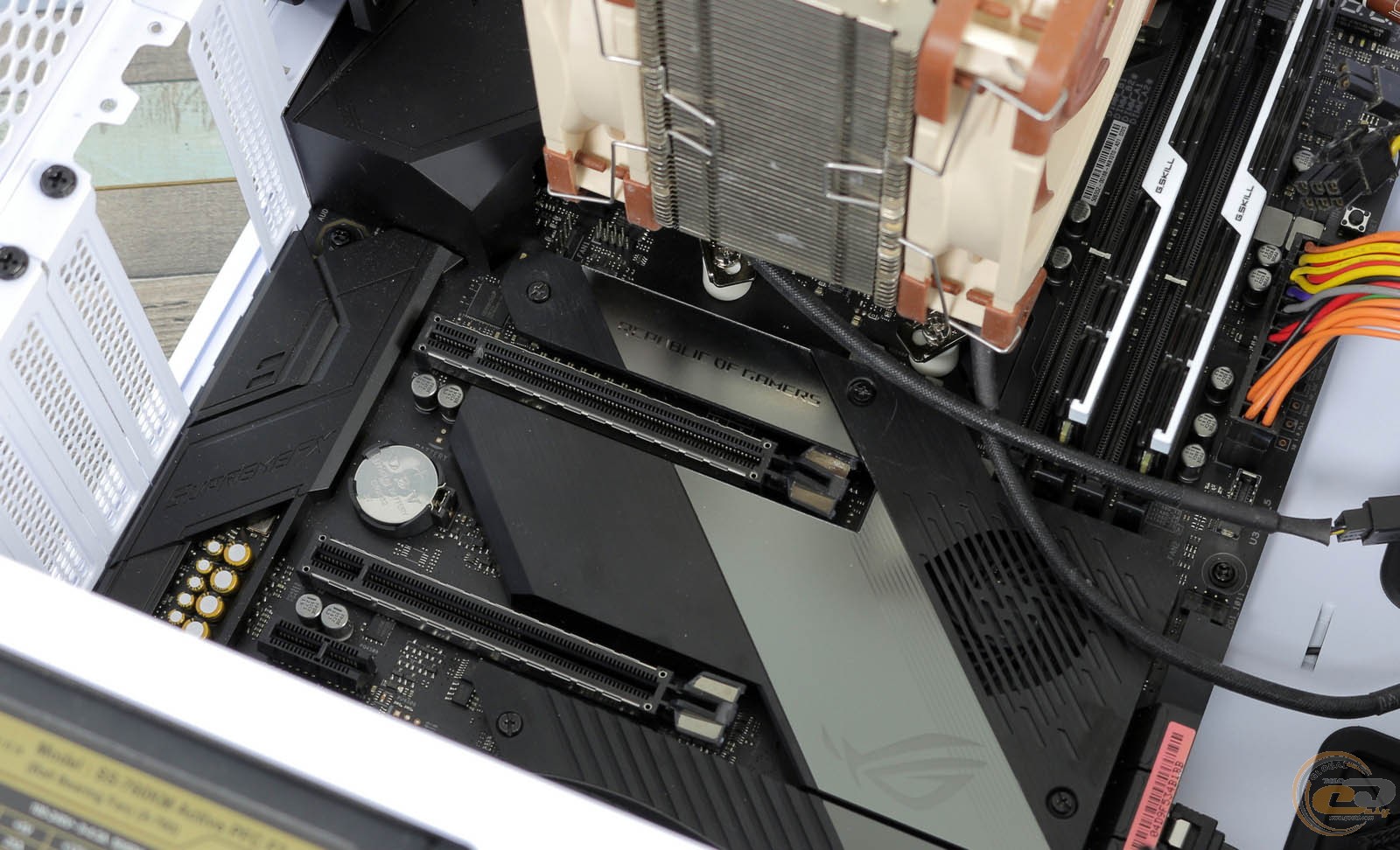 У піддоні материнської плати розташований виріз для зручного встановлення і демонтажу системи охолодження CPU з опорною пластиною (backplate). Для укладання дротів передбачені п'ять отворів з гумовими ущільнювачами і цілий розсип кріплень під комплектні стяжки.