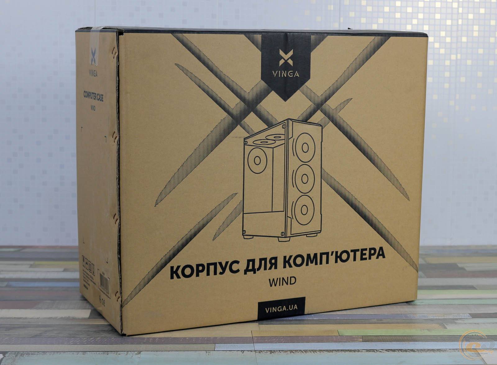 Vinga Wind запечатаний до звичної картонної коробки з простим оформленням. На її гранях можна знайти схематичне зображення корпуса, його назву та специфікацію англійською та українською мовами. З боків є вирізи для зручного транспортування.