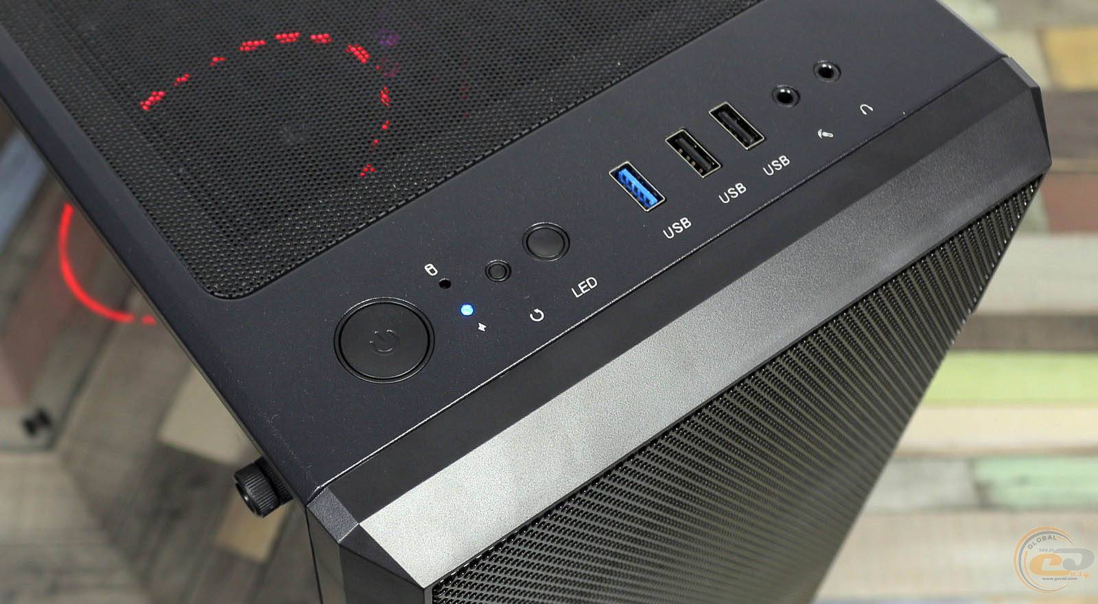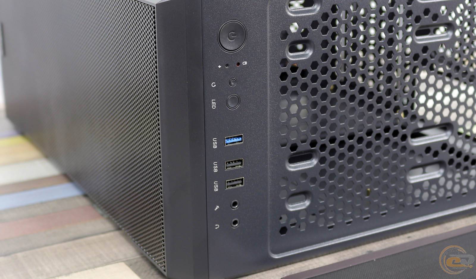 Зовнішні порти розташувалися на верхній панелі. Тут є два USB 2.0, один USB 3.0 і пара 3,5-мм аудіо роз'ємів для мікрофона і навушників. Поруч знаходяться кнопки ввікнення і перезавантаження. Біля них притулилася кнопка LED. Вона стане в нагоді вам лише в тому разі, якщо самостійно докупити контролер і вентилятори з підсвічуванням.