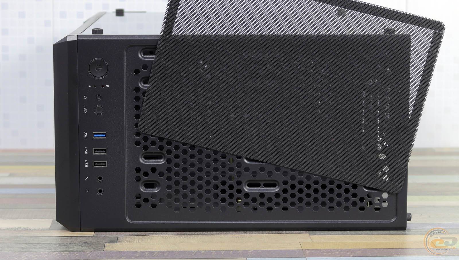 Передня панель виконана з пластика з сітчастою вставкою для кращої циркуляції повітря. За нею сховалися посадкові місця для трьох 120-мм вентиляторів. Замість них можна закріпити радіатор для водянки типорозміром до 360 мм.