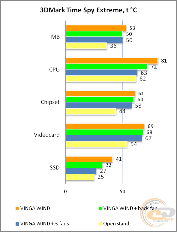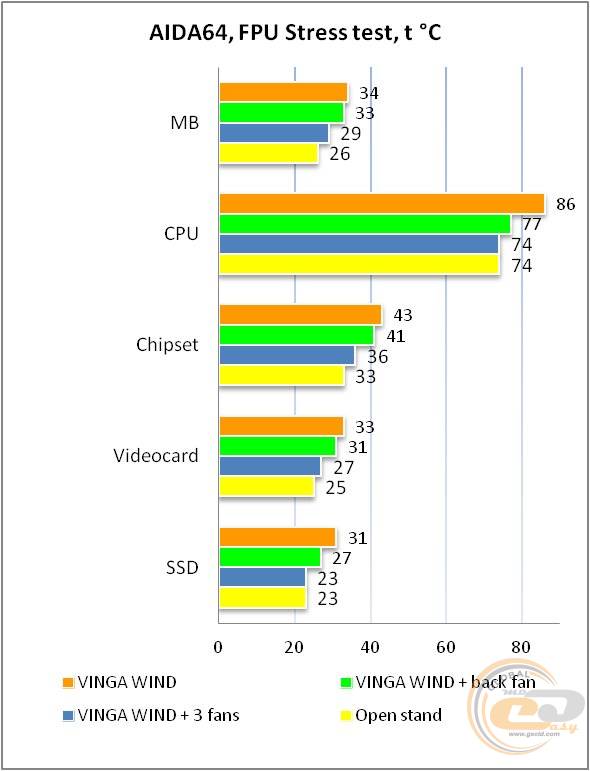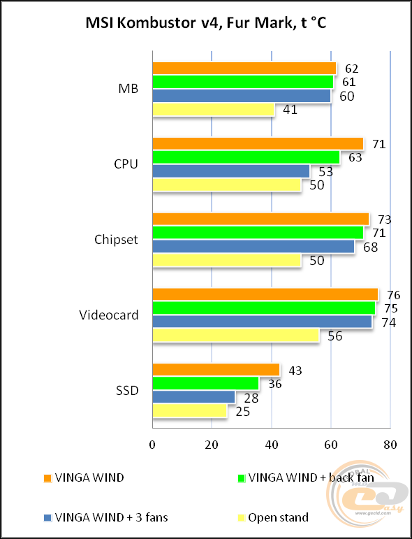 При максимальному навантаженні, створеною комбінацією стрес-тестів MSI Kombustor і FurMark, найбільша різниця між відкритим стендом і корпусом без вентиляторів досягла 20°С для відеокарти, 21°С для процесора і для материнської плати, а також 18°С для SSD.