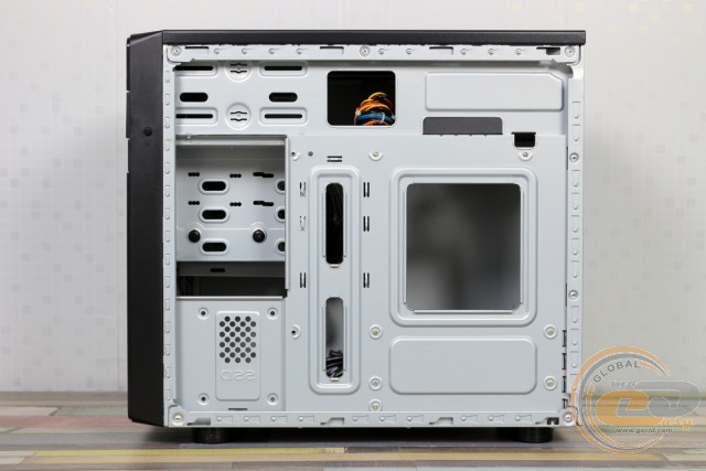 Навіть якщо всередину даного корпуса ви захочете встановити великий процесорний кулер (всяке може бути), виріз на піддоні дозволить виконати дану процедуру без зняття системної плати. А ось близькість боковини змушує лише мріяти про приховане укладанні дротів.