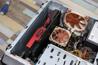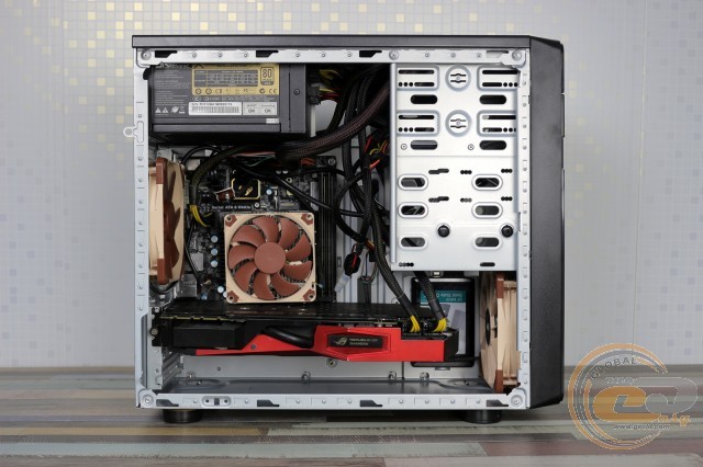 Оскільки ми тестуємо далеко не офісну систему з потужною дискретною відеокартою, то всередину Vinga CS303B була встановлена парочка вентиляторів Noctua NF-F12 PWM на вдув і видув (1500 об/хв), і замінено блок живлення на стендовий Seasonic X-560 Gold.