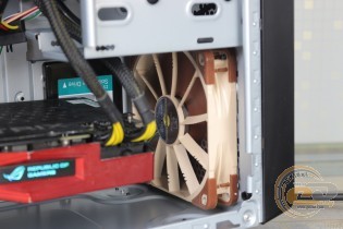 Поруч з твердотілим носієм можна поселити 120, 92 або 80-мм вентилятор, що направляє прохолодне повітря всередину корпуса. При цьому врахуйте, що отвір для його надходження є лише на нижній грані передньої панелі. Нагадаємо, що співпрацюватиме з переднім пропелером тильний 120-мм або 80-мм, який виводить нагріте повітря за межі корпуса. Правда, купувати всі ці компоненти власнику новинки доведеться окремо.