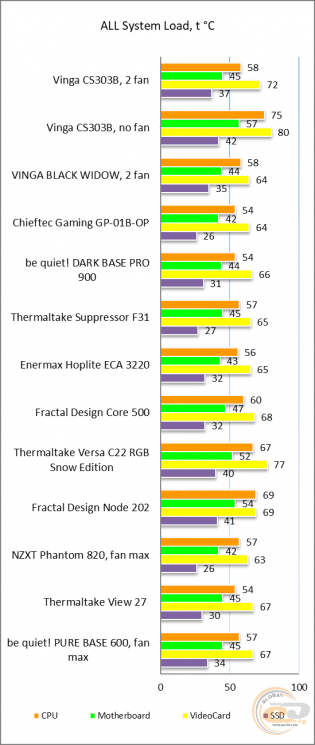 Звичайно ж, малоймовірно, що хтось збиратиме таку потужну систему на основі корпуса Vinga CS303B. Однак нам було дуже цікаво дізнатися, як у такому разіу поведеться новинка – з вентиляторами і без них. Повністю без пропелерів наш процесор нагрівався до 98°C, а з ними його температура не перевищувала 75°C. Незважаючи на суцільну передню панель, вентилятори відразу ж дали про себе знати помітним зниженням температур процесора й відеокарти, так що власникам дискретної графіки безперечно варто запастися хоча б тильним пропелером. У такому режимі новинка не настільки помітно відстає від габаритніших Middle Tower-корпусів, які побували в нас раніше, хоча дещо підвищене нагрівання відеокарти все ж є.