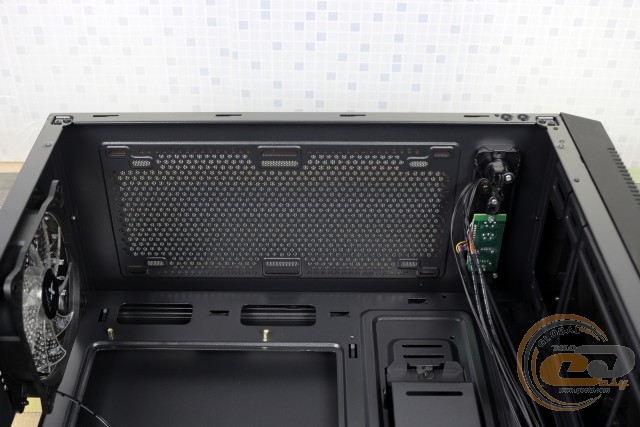 Вищезазначені посадкові місця для вентиляторів або радіатора СВО радують своїм виглядом. А ось із-під верхньої стінки дроти, що виглядають, і начинка інтерфейсної панелі вже не настільки привабливі.