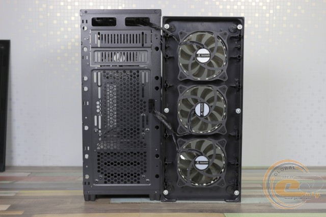 При бажанні панель можна зняти, оскільки вона кріпиться на засувках. Надмірних зусиль для цього не потрібно, але тримається вона надійно. Після її демонтажу відкривається вид на шасі. У той же час видно, що штатні 120-мм RGB-пропелери закріплені безпосередньо на самій стінці.