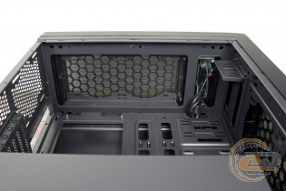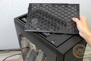 Також на верхній панелі є перфорована кришка, аналогічна до фронтальної, яка відкриває доступ до посадкових місць для пари 140-мм / 120-мм пропелерів або 240-мм радіатора СВО. Нагадаємо, в доступніших рішеннях останній можна було розмістити лише за передньою панеллю (що, до речі, можливо й у даній новинці). Однак при встановленні вгорі нагріте повітря відразу виводитиметься назовні.