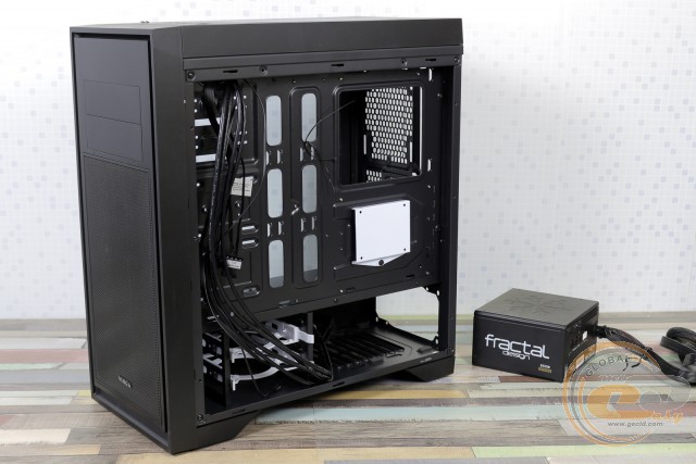 Кошик для жорстких дисків дещо обмежує довжину джерела живлення. В принципі, сюди помістяться 170-мм моделі (з 40-мм простором для кабелів живлення), проте найзручніше буде підключити звичайне рішення з довжиною 140-мм (на фото компактна 650-Вт модель Fractal Design INTEGRA M 650W).