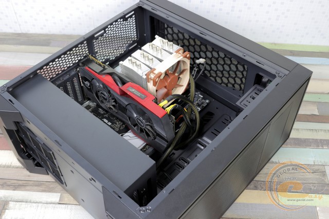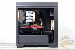 Відеокарта ASUS ROG Matrix Platinum GTX 980 з довжиною 309 мм запросто поміщається всередині, а вільний простір за нею недвозначно натякає на можливість встановлення ще габаритніших тривентиляторних рішень (наприклад, GTX 1080 Ti), довжина яких може сягати 405 мм. Якщо ж ви зважитеся встановити радіатор СВО на передній панелі, тоді цей показник зменшиться до все одно чималих 345 мм.