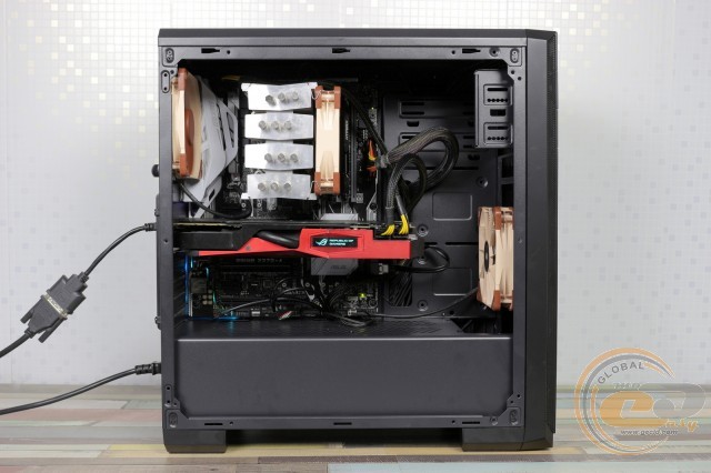 Пофарбована в чорний колір тильна панель радує можливістю встановлення 120-мм пропелера з невеликим регулюванням по висоті. Нижче знаходяться сім слотів розширення, фіксацію пристроїв у яких допомагає виконати зовнішня притискна планка. Блок живлення притулиться на дні корпуса.