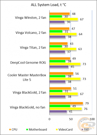 - хороші температурні показники компонентів при встановленні пари вентиляторів.