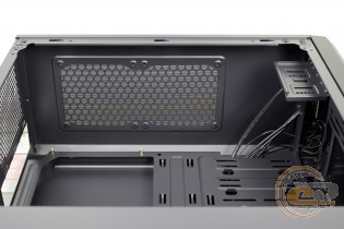 Кошик знаходиться на певній відстані від передньої панелі, тим самим обмежуючи довжину джерела живлення. Проте сюди без проблем помістилася 160-мм модель Seasonic X-560 Gold з модульною конструкцією кабелів. Як і личить зразковому рішенню, місце встановлення БЖ дбайливо оснащене антивібраційними елементами на дні й боковій стінці.