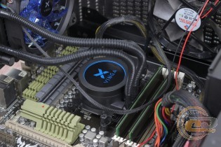 Два кутових фітинга з боку помпи мають поворотну конструкцію, що спрощує укладання шлангів всередині корпусу після установки водоблока на процесор. При цьому гофровані пластикові шланги без додаткової обплетення не перегинаються всередині системного блоку. Їх довжина становить цілком стандартні 330 мм
