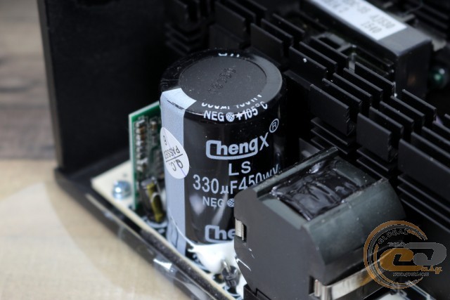 Вхідний електроліт представлений творінням компанії ChengX (330 мкФ х 450 В). Його ємність в півтора рази вища, ніж у вживаного усередині 500-ватника - це вже хороший показник. У списку переваг також приналежність до високотемпературної серії. Шкода тільки, що репутація даного виробника, на жаль, не найкраща.