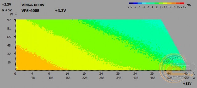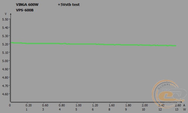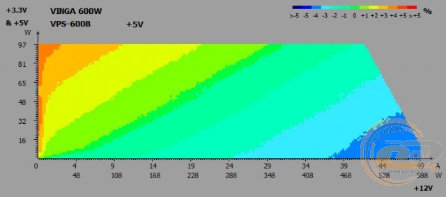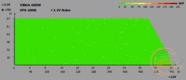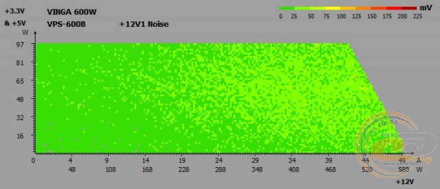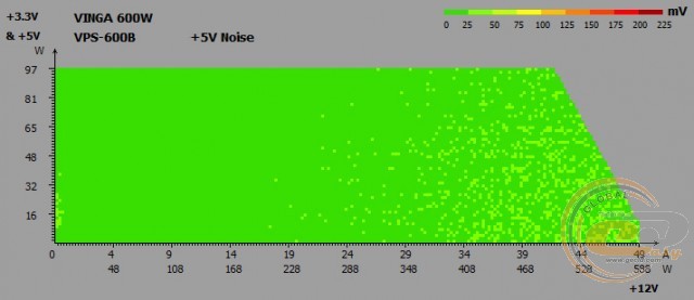Напруги на виході Vinga VPS-600B весь час залишаються в «плюсі», не перевищуючи при цьому допустиме 5-відсоткове відхилення. Отже, під навантаженням (режим «Burn») і при бездіяльності системи (режим «Idle») комплектуючі отримуватимуть необхідне для їх стабільної роботи живлення, а різниця між двома режимами складе максимум 0,04 В.