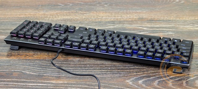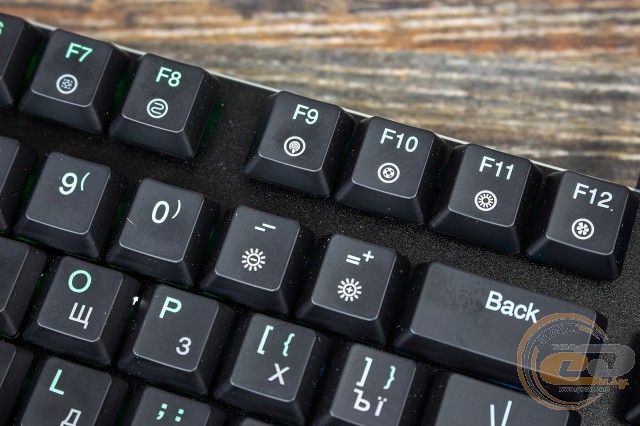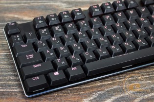 Стандартний набір повнорозмірних клавіш виконаний з гладкого пластика з УФ-покриттям. Розкладка представлена в класичному американському варіанті (US ANSI), так що звикати не доведеться. І хоча всі символи нанесені лазерним способом, через особливості конструкції перемикачів кирилиця підсвічується мінімально.