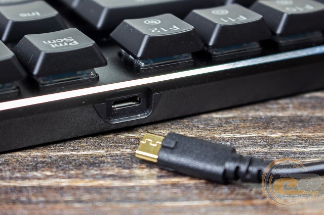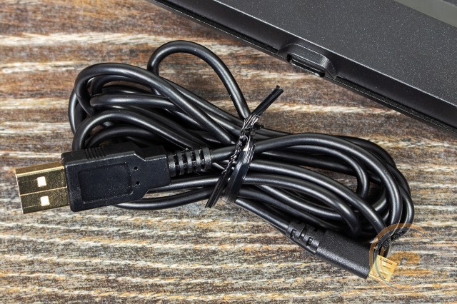 Клавіатура підключається до ПК за допомогою знімного USB-кабелю (microUSB ↔ USB Type A) довжиною 1,8 м. Він позбавлений нейлонового обплетення і феритового фільтра, має звичайну товщину, а з приємного відзначимо позолоту конекторів і простоту заміни при втраті або поломки.