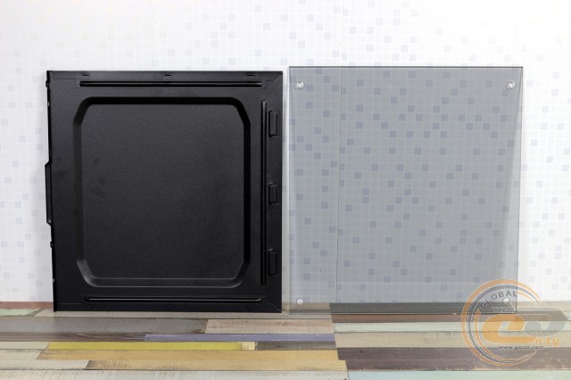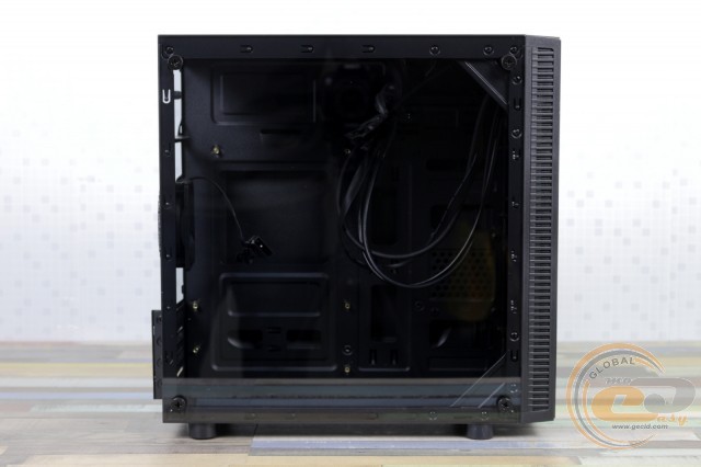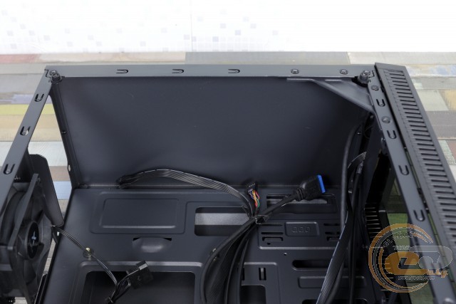 До шасі панель кріпиться шістьма засувками, тому зняти її можна без будь-яких труднощів. За нею виявляємо пару посадкових місць для 120-мм пропелерів. Скло так і просить встановити тут вентилятори з LED-підсвічуванням, а прохолодне повітря буде надходити через отвори в пластиці з боків і внизу. Захисту від пилу зовсім немає.