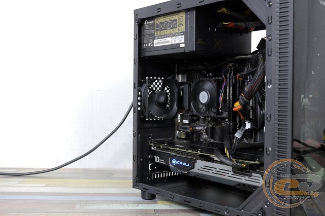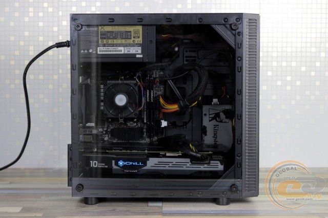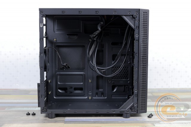 Зрозуміло, що скромних $31 в іншому вистачило лише на базові потреби. Маємо тонкий метал (0,45-0,5 мм) і відповідну жорсткість конструкції, а також верхнє розташування БЖ. Оскільки стійки для накопичувачів тут немає, то в є багато простору для встановлення габаритних відеокарт. Але ось дискова підсистема обмежиться максимум трьома пристроями, два з яких будуть обдуватися і підігріватися відеокартою, при наявності такої. У такому разі встановлення передньої вертушки просто обов'язкова, хоча і комплектний 80-мм вентилятор вносить свою лепту в охолодження внутрішнього простору.