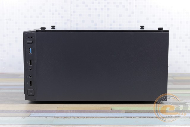 На верхній кромці знайшлося місце для звичних портів і кнопок. У їх числі яскраві LED-індикатори, клавіша перезавантаження, один USB 3.0, пара USB 2.0 з аудіороз'ємами і кнопка ввімкнення. Незадіяних заглушок тут немає, і це приємно.
