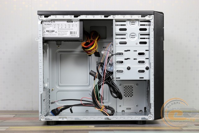 У Vinga CS303B можна зустріти як елементи простеньких офісних системників десятирічної давності, так і риси цілком сучасних корпусів. Анахронізмом можна назвати стійку для накопичувачів, наявність якої, проте, позитивно впливає на жорсткість конструкції. Більш того, вона закінчується на рівні слотів розширення, дозволяючи встановити довгі відеокарти.