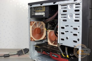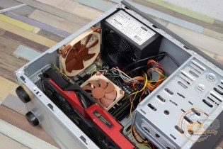 Оскільки ми тестуємо далеко не офісну систему з потужною дискретною відеокартою, то всередину Vinga CS303B була встановлена парочка вентиляторів Noctua NF-F12 PWM на вдув і видув (1500 об/хв), і замінено блок живлення на стендовий Seasonic X-560 Gold.