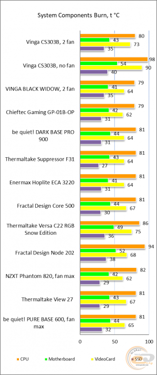 Звичайно ж, малоймовірно, що хтось збиратиме таку потужну систему на основі корпуса Vinga CS303B. Однак нам було дуже цікаво дізнатися, як у такому разіу поведеться новинка – з вентиляторами і без них. Повністю без пропелерів наш процесор нагрівався до 98°C, а з ними його температура не перевищувала 75°C. Незважаючи на суцільну передню панель, вентилятори відразу ж дали про себе знати помітним зниженням температур процесора й відеокарти, так що власникам дискретної графіки безперечно варто запастися хоча б тильним пропелером. У такому режимі новинка не настільки помітно відстає від габаритніших Middle Tower-корпусів, які побували в нас раніше, хоча дещо підвищене нагрівання відеокарти все ж є.