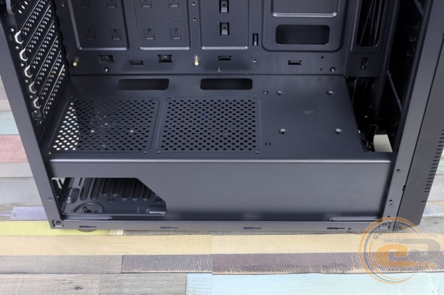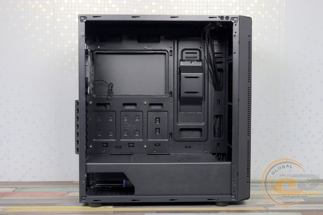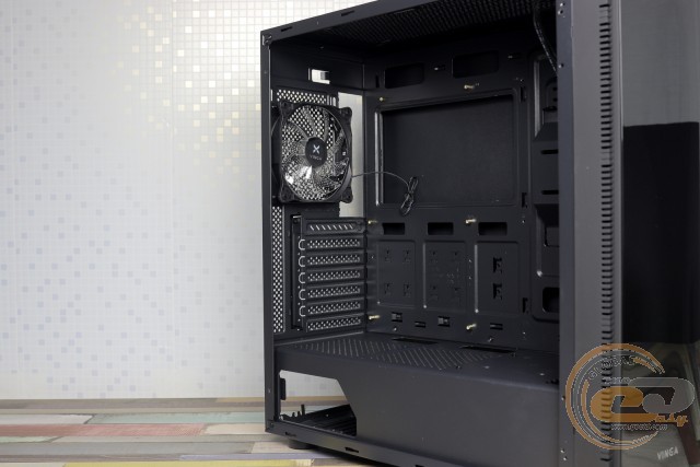 У передній частині шасі є «рейки» для монтажу максимум трьох 120-мм вентиляторів. Крім того, на самій передній панелі присутні пластикові фіксатори для даних пропелерів. Рішення як би зручне, проте захоплювати прохолодне повітря їм буде ніде. За посадковими місцями для вентиляторів у нижньому тунелі передбачений виріз, завдяки якому стінку можна використовувати і в якості опори для радіатора СВО довжиною до 360 мм.