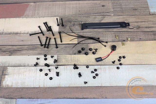 Комплект поставки включає в себе необхідні аксесуари для складання комп'ютера: набір стійок і гвинтів для кріплення материнської плати, блоку живлення, вентиляторів, накопичувачів і навіть радіаторів СВО. Крім цього, є багаторазова заглушка для слотів розширення, кілька одноразових стяжок для проводів і системний динамік.