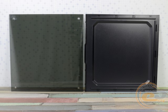Ліва панель являє собою загартоване тоноване скло розмірами 409 х 435 мм і товщиною 3,15 мм. Права стінка - це звичний лист металу товщиною 0,5 мм, посилений ребром жорсткості. Тут же є штампування, яке можна використовувати як додаткове місце для укладання проводів.