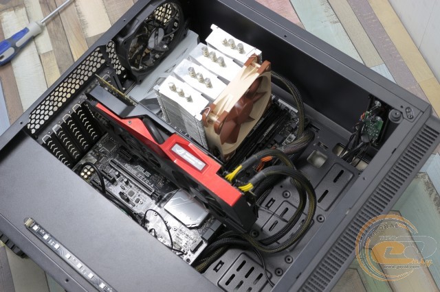 Згідно з нашими вимірами, в корпус помістяться відеокарти довжиною до 380 мм. У нашому випадку після установки штатної ASUS ROG Matrix Platinum GTX 980 довжиною 309 мм залишилося багато вільного простору.