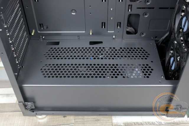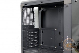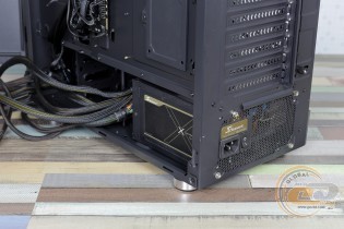 Кошик знаходиться на певній відстані від передньої панелі, обмежуючи довжину джерела живлення. Проте сюди без проблем помістилася 160-мм модель Seasonic X-560 Gold з модульною конструкцією кабелів. Як і личить зразковому рішенню, місце встановлення БЖ дбайливо оснащене антивібраційними елементами на дні та боковій стінці.