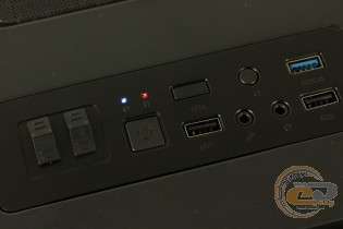 Верхня ж панель відображає більш звичний підхід. Так, маємо два посадкові місця для 120-мм пропелерів або радіатора СВО, що прикриваються знімним пиловим фільтром із магнітним кріпленням. Тут же знайшлося місце для інтерфейсів, представлених одним USB 3.0, двома USB 2.0, парою аудіороз’ємів, трьома кнопками (управління LED-підсвічуванням, перезавантаження і ввімкнення), а також двома індикаторами помірної яскравості.