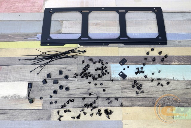 Комплектні гвинти і стійки супроводжуються цілою низкою корисних дрібниць: системним динаміком, одноразовими стяжками для проводів, вушками для замків на боковини, заглушками для інтерфейсів, чотирма запасними антивібраційними прокладками в лоток для накопичувача і рамкою для монтажу пропелерів.