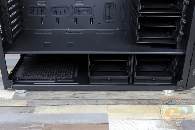Нижче розміщені три кошики для накопичувачів, у кожний з яких можна встановити два 3,5" або 2,5" рішення. Антивібраційні прокладки для повнорозмірних жорстких дисків є. Самі кошики знімні, але демонтувати все не обов'язково - можна обійтися тільки однією-двома, що заважають встановленню відеокарти або радіатора СВО. Та й наявність додаткових отворів дозволяє гнучко регулювати їх висоту з проміжком у декілька сантиметрів.