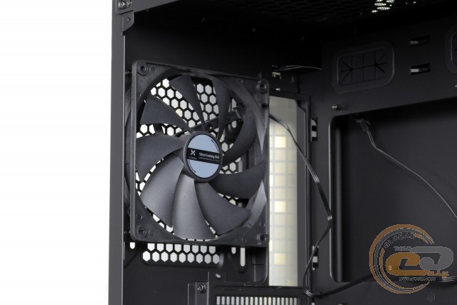 Тильна панель відразу ж видає наявність вгорі корпусу місця для встановлення радіатора СВО. Велика ширина пристрою (243 мм) дозволила розмістити тут 140-мм пропелер із невеликою можливістю зміщення для кращої співпраці із процесорним охолоджувачем. Поруч маємо виріз інтерфейсної панелі, для підсвічування якої застосовується пара жовтих світлодіодів. Погодьтеся, таке підсвічування зайвим не буває! Хоча і його при бажанні можна відключити, від'єднавши роз'єм живлення PATA.