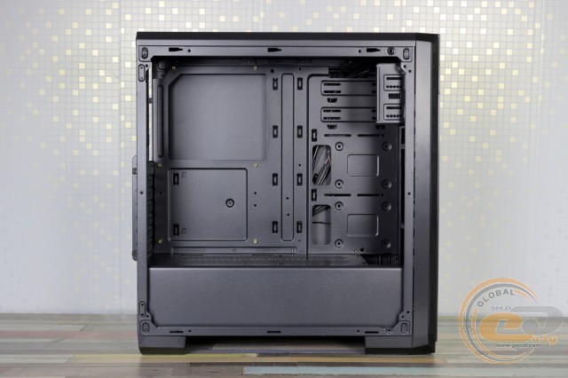 Обидві боковини мають хорошу жорсткість завдяки товщині 0,72 мм і ребрах по периметру. Права − суцільний лист стали, тоді як більшу площу лівої займає затемнене акрилове вікно розміром 330 х 292 мм, явно розраховане на застосування комплектуючих з LED-підсвічуванням. Обидві боковини кріпляться за допомогою гвинтів з фігурними голівками, а знімаються зсувом до тильної частини.
