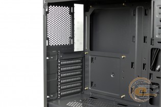 Шасі дозволяє встановити пару 5,25" пристроїв, але, нагадаємо, передня панель розрахована на реалізацію лише верхнього з них. Традиційно для корпусів Vinga ліва частина кріплення має невелику довжину, тому найкраще забезпечити й фіксацію праворуч.